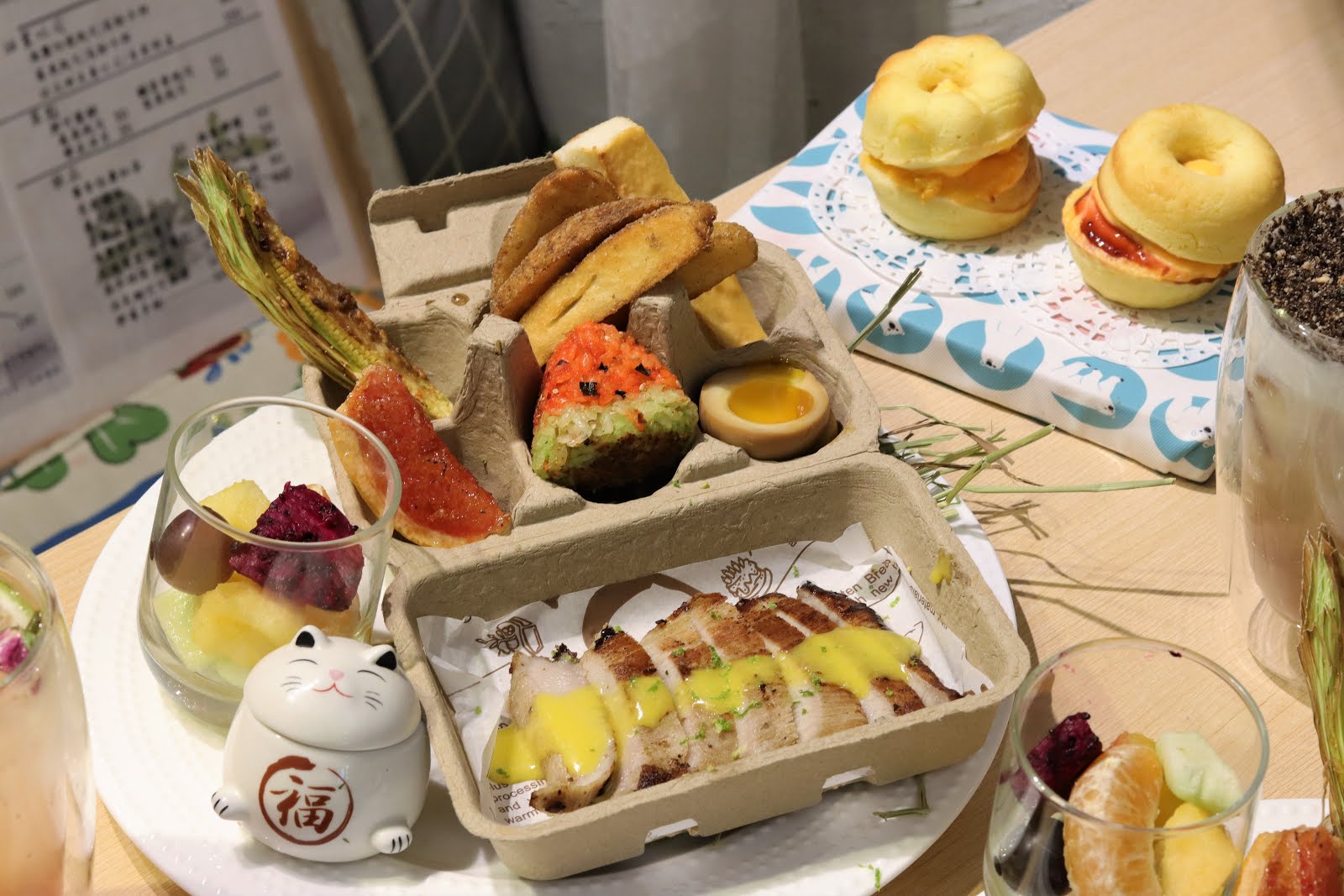 每份雞蛋盒都會附爆米花南瓜濃湯、胖可鬆餅、沙拉、糖心蛋、焦糖葡萄柚、優格、西瓜烤飯糰、起司麵包條、帶皮洋芋及50元飲品(超過可補差價)