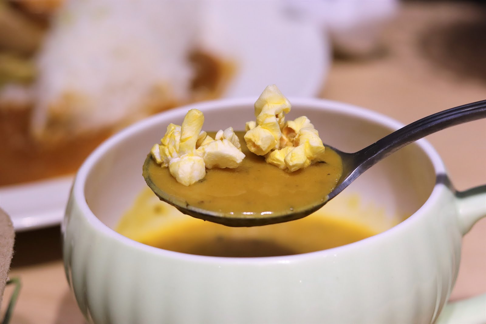 加上爆米花一起吃多了奶油的香氣,這樣有一種取代了一般會將麵包丁加入濃湯一樣的吃法,非常特別也意外的融洽內。