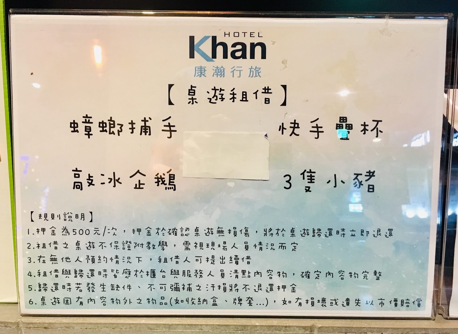 現在的旅館很多都有桌遊租借,「康瀚行旅 Khan Hotel」則是可免費借用蟑螂捕手、快手疊杯、敲冰企鵝、3隻小豬...等老少咸宜的經典款桌遊,用完就會退還500元押金,讓入住時光充滿樂趣。