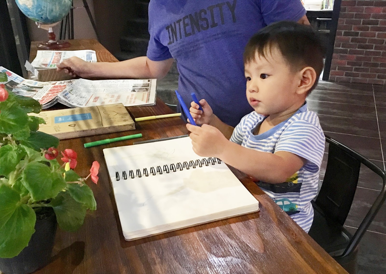 窗前的桌上,有許多款式的彩色筆和紀念章,可以在記事本中塗鴉留念,來個「到此一遊」的足跡,小福寶盡情地塗塗畫畫,好開心啊。