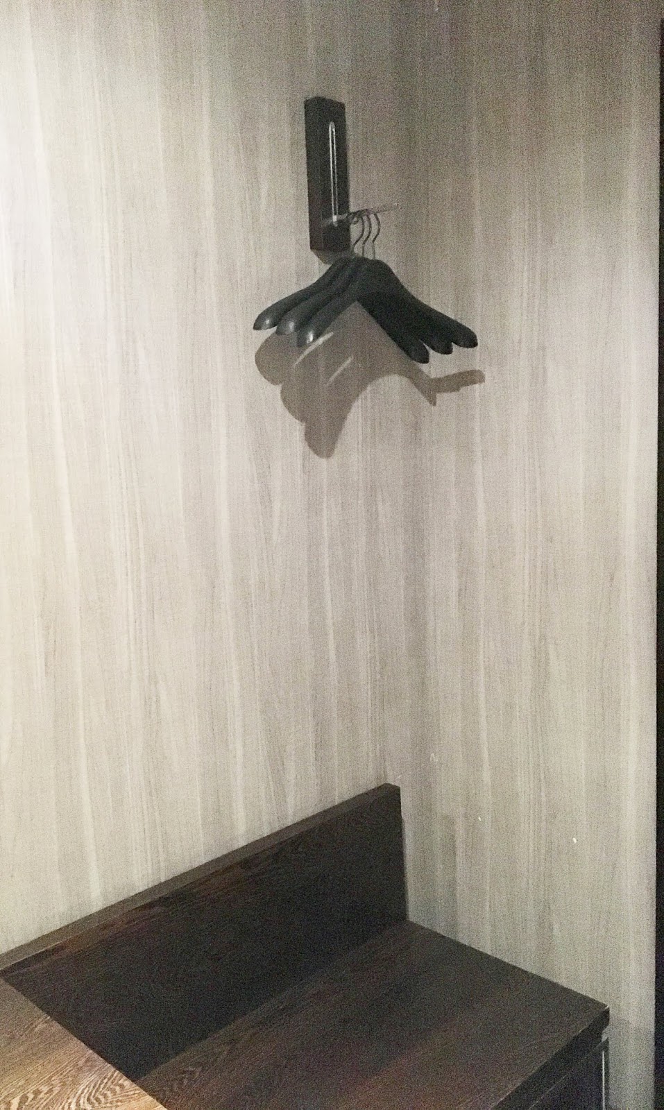 玄關處的簡易衣架充分運用空間,雖然不能掛很多衣物,但短住還可以,私心希望多一點掛勾,這樣一家三口的衣服才夠放。