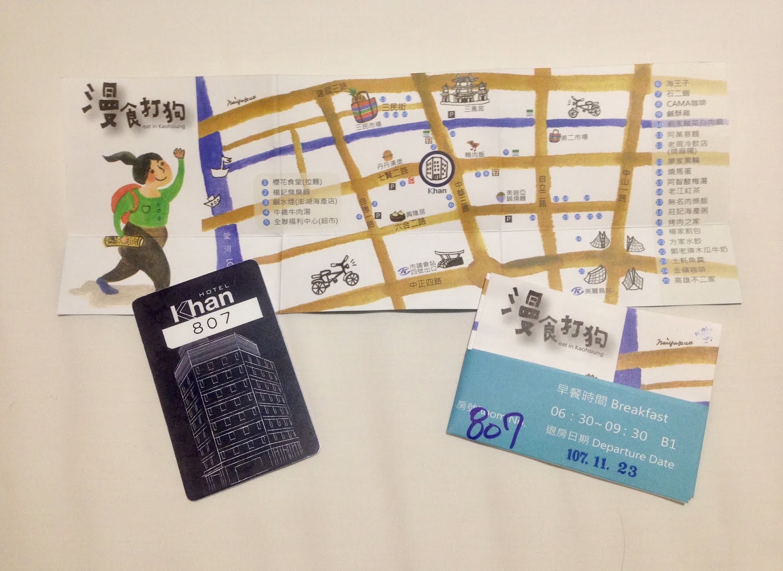 我們先到櫃檯辦理入住手續,服務人員給我們房卡和早餐券,房卡卡套可展開為精美的美食地圖,令人想收藏作為紀念。服務人員特別說明平時並沒有早餐券,而是50元現金抵用券,可自行到「丹丹漢堡-七賢店」、「興隆居」、「果貿來來豆漿-六合店」和「OK超商七賢二店」購買早餐抵用現金,但這幾天剛好有團客,有旅館準備的自助式早餐可享用,我們好幸運啊!不過,愛吃的我們,也決定好在旅館用早餐,午餐吃知名傳統早餐店「興隆居」,這樣才不會漏掉當地美食。