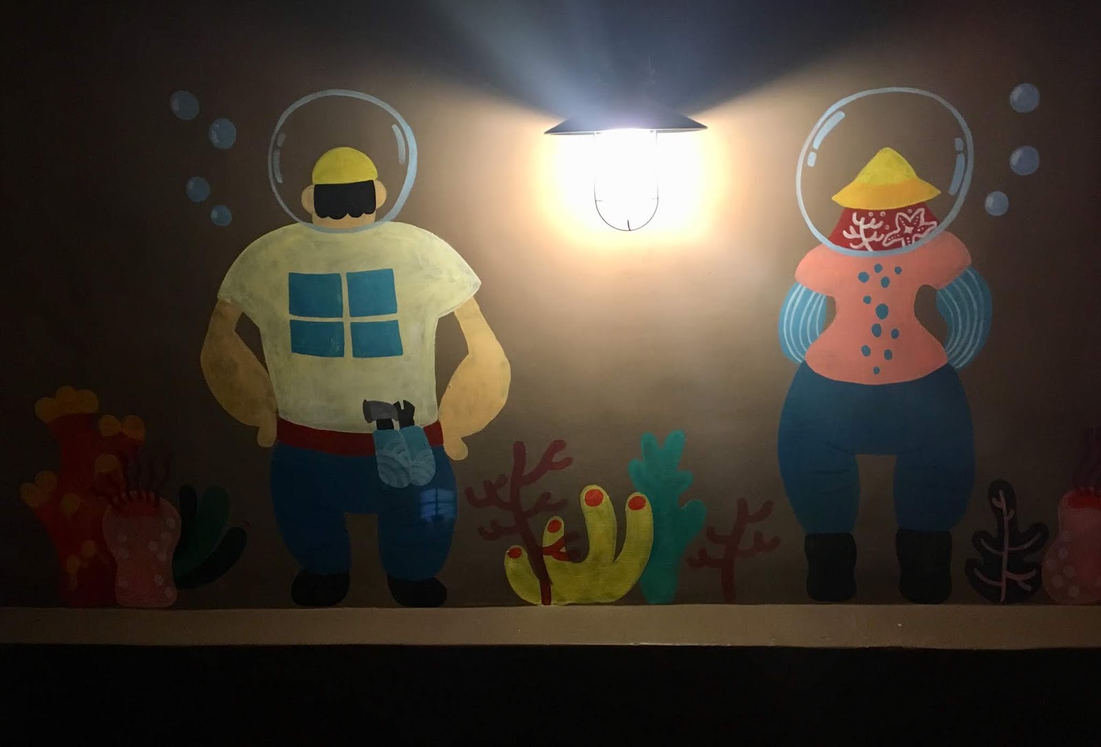 再往上走,每個樓梯轉角都有生動逗趣的壁畫,這是「康瀚行旅 Khan Hotel」邀請到插畫家-簡佳慧(