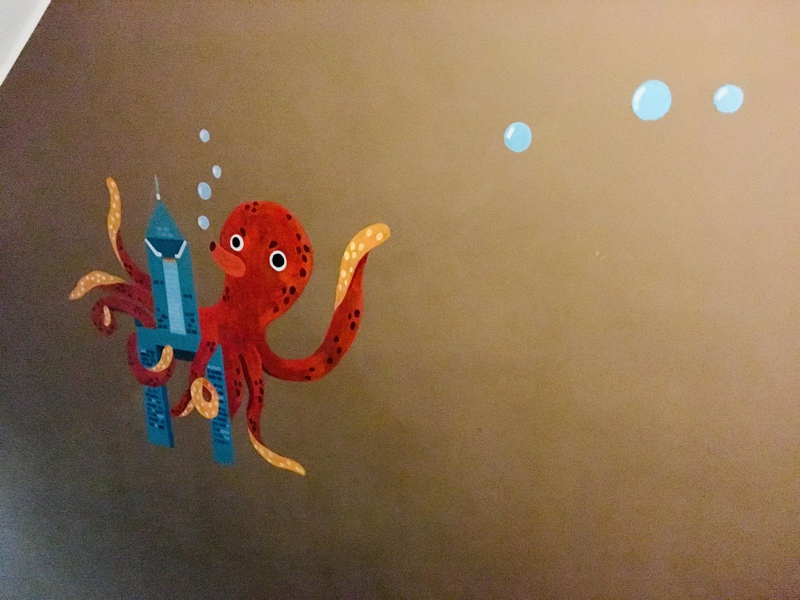 減加加ChiaArt)所繪製的「海洋高雄」,有水母與潛水員、燈塔與美人魚、旗津渡輪與海鷗、星空下的鯨魚、攀爬85大樓的章魚、海底的駁二,一幅幅充滿想像力與生命力的畫作使得爬樓梯變得饒富趣味。