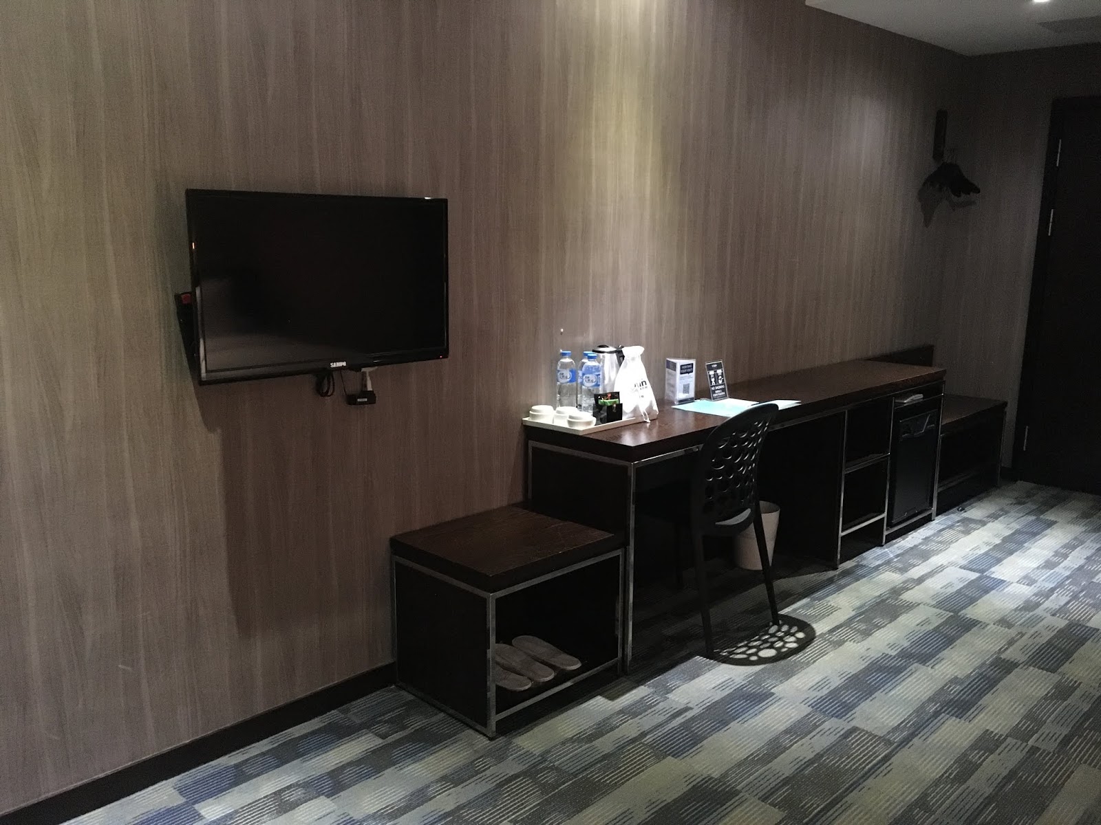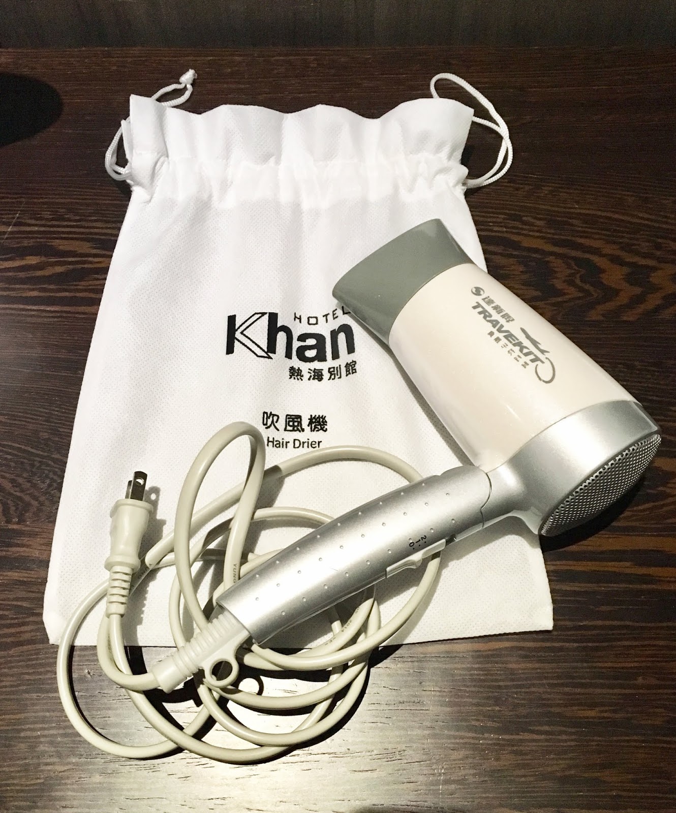 電視牆前的桌上,備品一應俱全,有礦泉水、茶葉、咖啡、熱水壺、茶杯、吹風機...,雖然有礦泉水和熱水壺,但我們還是習慣拿水壺到地下室飲水機裝水,吹風機是達新牌的,吹起來熱度夠熱。