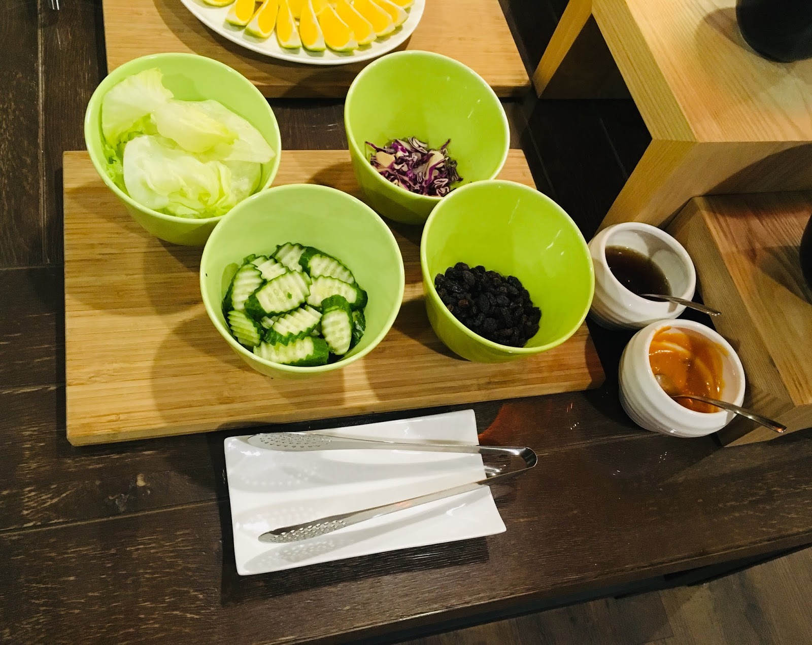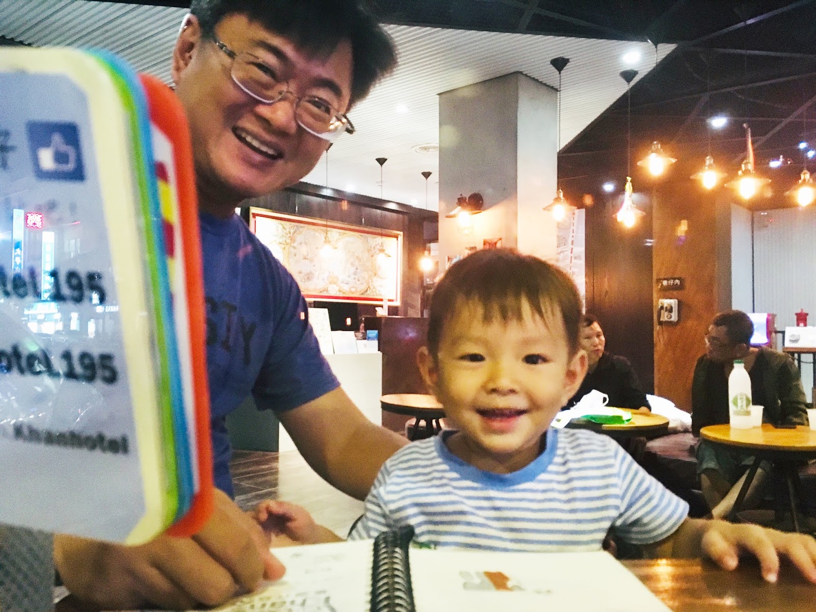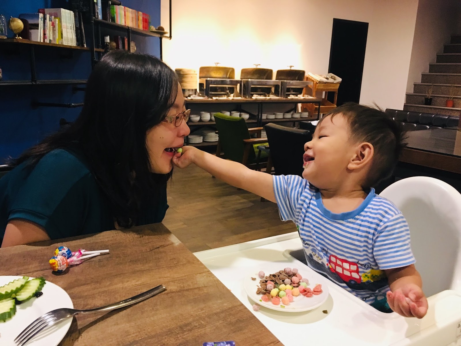 才剛吃飽不久,老公帶著起床找媽媽的小福寶下樓,Buffet的多樣菜色讓挑嘴的小福寶有許多選擇,我們不太需要勸菜,只要把食物放在面前等他點菜就好,即便小福寶每一種都只吃一口也是吃得很飽,還大方分享喜歡的穀物餵爸爸、媽媽吃。