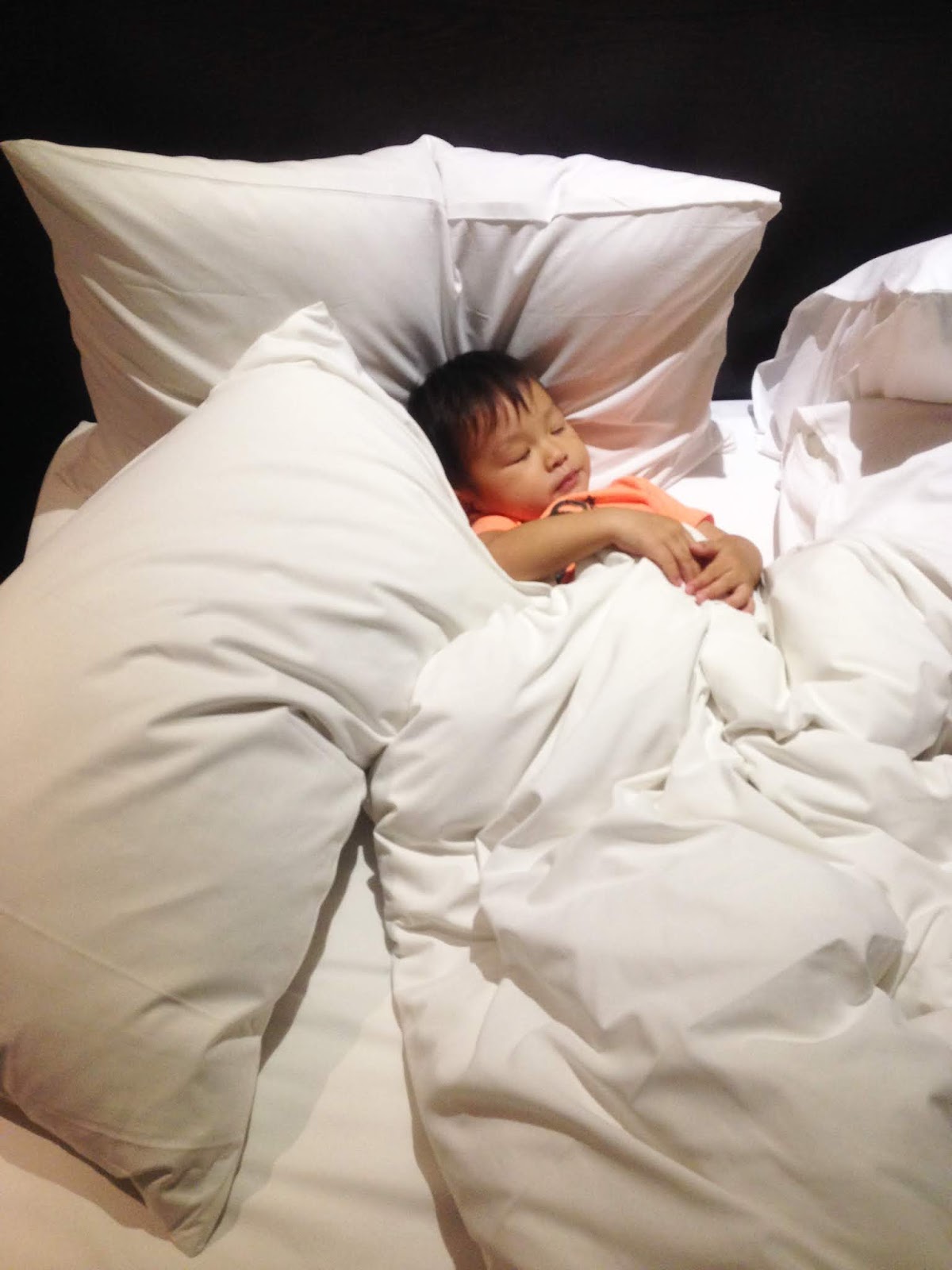 小福寶每次進旅館房間,第一件事就是來試躺床鋪,他滾了幾圈後,躲進被窩閉上眼享受,看來對床鋪的舒適度相當滿意。