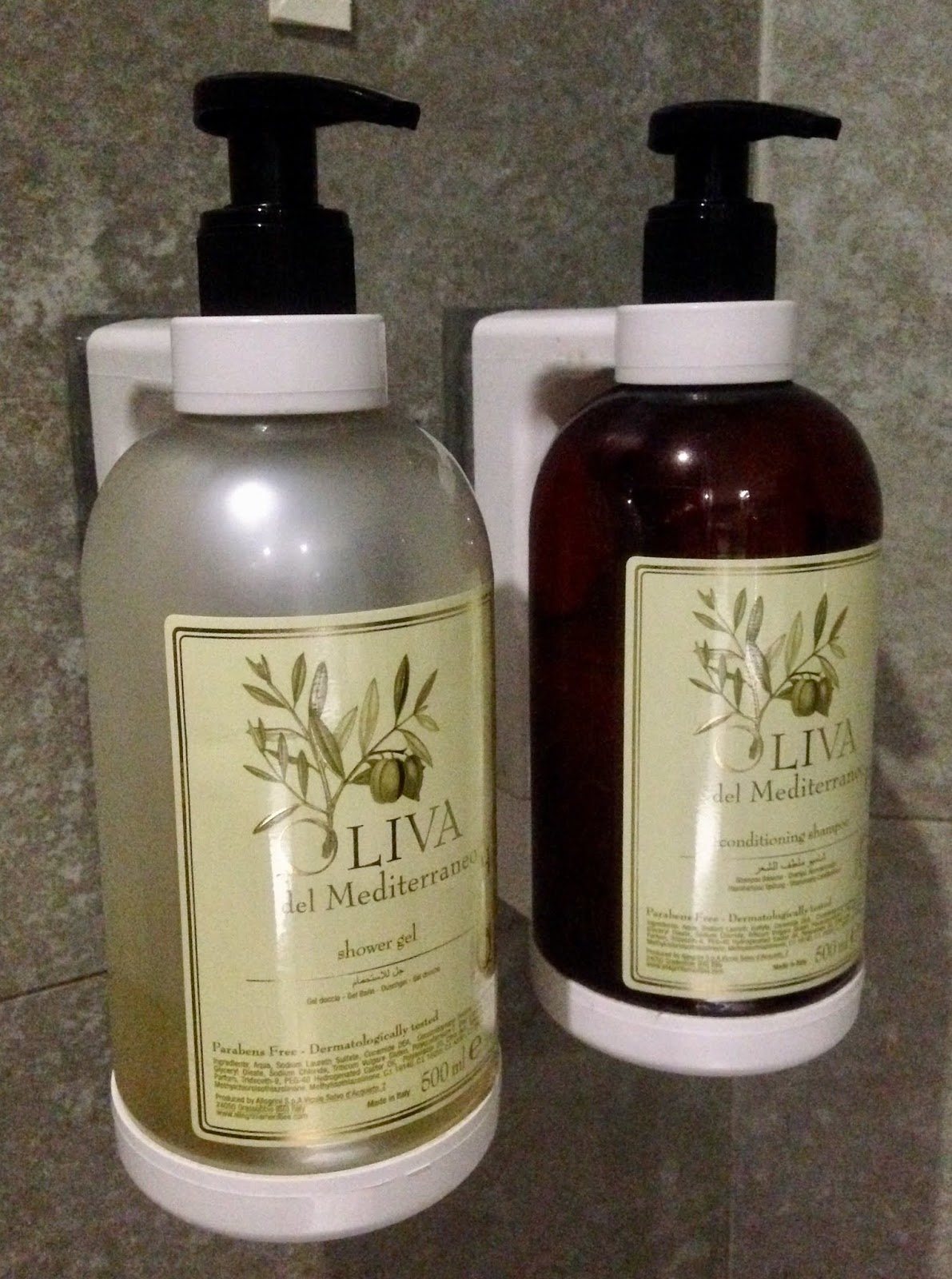 牆上壁掛著義大利進口的OLIVA del Mediterraneo沐浴乳和洗髮精,洗後的感覺很潔淨天然,這種按壓式的瓶裝很環保,只取自己需要的量,不會有多餘的浪費。
