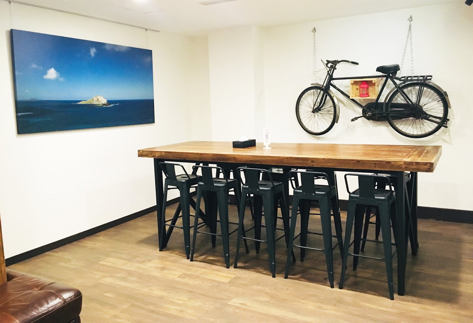 「會議交誼廳」的各活動區域有不同的特色,有輕鬆閒適的沙發閱讀區、用餐區有高雄在地「DOMO藝術屋」創作的「港都之美」壁畫、多人長桌的牆上掛著復古腳踏車,旅人總是可以在此找到適合自己的位置。