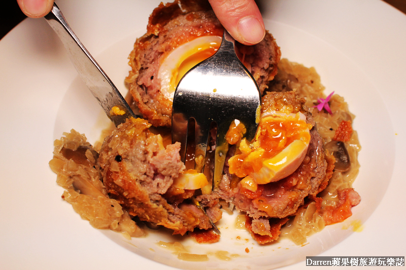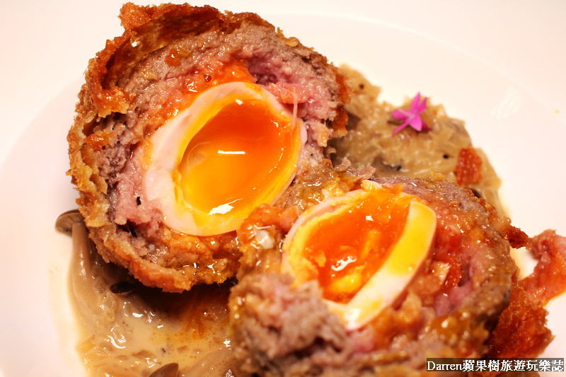 蘇格蘭蛋就是將水煮蛋混合著豬肉或牛肉的絞肉,再抹上麵包粉弄成丸子形狀下去油炸的料理,刀叉劃開蘇格蘭炸蛋