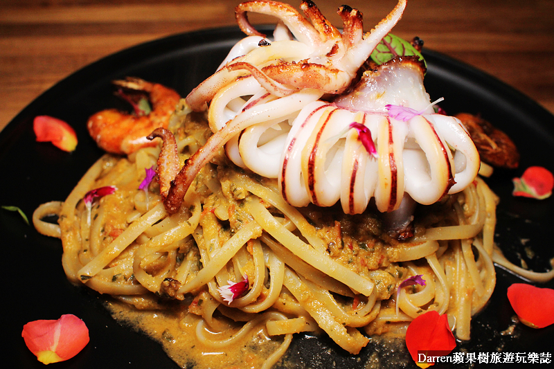 而是用青醬使用蘿勒、辣椒和蒜頭、橄欖油、起司等,再加入蕃茄就變成另類的粉紅醬,放上整隻的透抽脆彈鮮甜