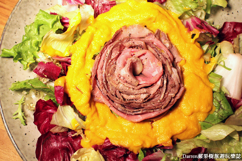 牛後腿肉,薄切之後烤到半熟,再裝盤成盛開的玫瑰花吃起來軟嫩,至於一圈黃色的醬料是用胡蘿蔔、洋蔥以及