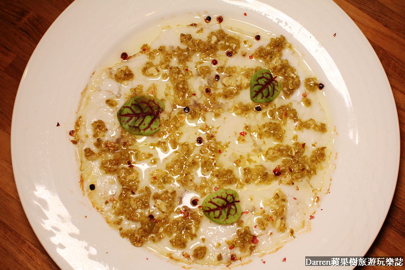 這道端上桌說是爐烤橄欖鱸魚,那魚呢!?其實這道料理是用片成薄片的鱸魚片,加上綠橄欖