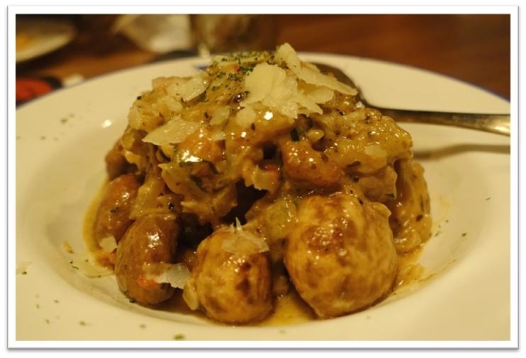 吃著吃著店員送上了一坨香氣逼人但是說實在長的不太美的東西…..說是店裡剛好在做牛肉丸請我們嚐一嚐.大部分我在外面不太會點牛肉丸覺得就是義大利肉醬捏一團而以沒甚麼特別.可是GOLOSO的牛肉丸絕對是來店必點的一道菜.牛肉丸彈牙,但吃得出是經過多次摔打肉本身的彈性.而不是市售貢丸的口感.調味的紅醬滿滿的包裹在肉丸子外頭,新鮮番茄的香氣不是罐頭可以媲美的!