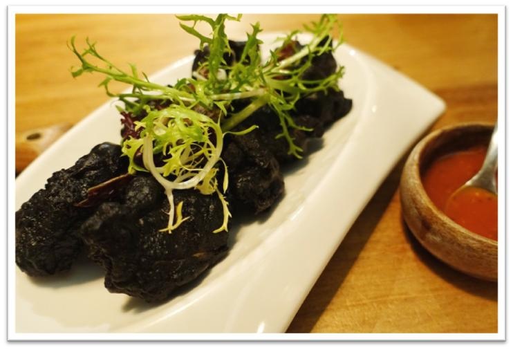 剛上桌黑黑的外表的確讓人望之卻步…店員解釋黑色部分是墨魚汁.沒想到裡面的雞肉多汁味美.不論是醃製的口味或是整體的口感都讓人驚豔!旁邊自製的辣醬讓我想起泰國菜…兩者非常的搭!