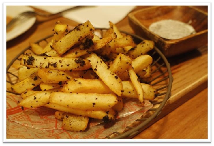 不知道是忘了還是?? 本來應該在餐前上的熱前菜到排餐上完才來. 薯條金黃酥脆,松露油的香氣十足.不用沾醬就很好吃了.旁邊的奶醬中有切碎的松露,帶點酸味.加上薯條別有一番風味.