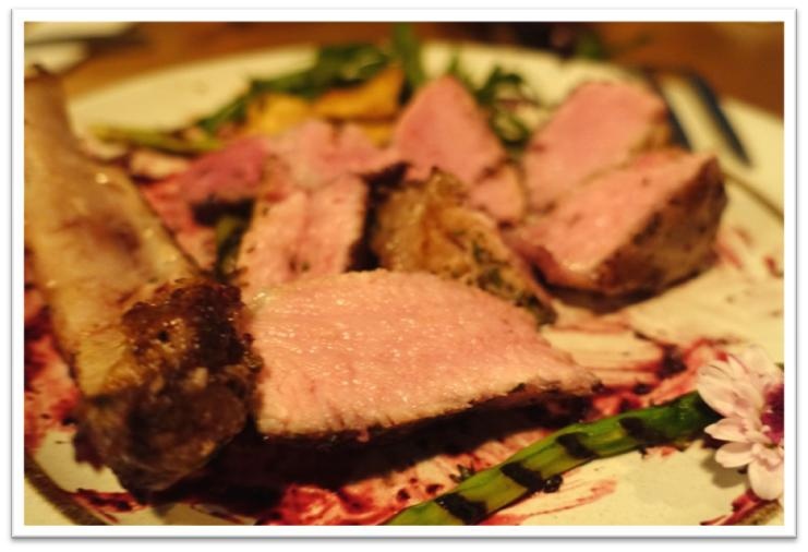 需要烹調40分鐘的里肌排在訂位時就先預訂了 (其實就是戰斧豬排,大里肌肉連著肋骨看起來就是斧頭的樣子).伊比利豬排七分熟就可以上菜,切開後剛熟的豬肉帶著淺淺的粉紅色.沒有過多的調味.只沾上一點點的莓果醬.Iberico跟一般豬比起來本身就多了一些香氣.油脂雖然豐厚卻帶著細密的口感.不膩口.