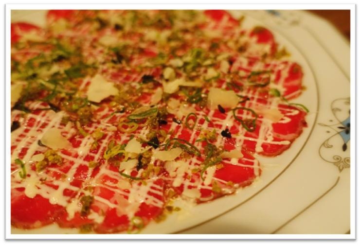 刨上少許的cheese,蔥花,淋上日式桔醋醬汁和美乃滋,這道無骨牛小排carpaccio在上桌時就吸引了大家的目光.很可惜我還是無法吃生食,但看得出牛肉品質很好!我想應該是很好吃吧~上桌不久就被一掃而空.