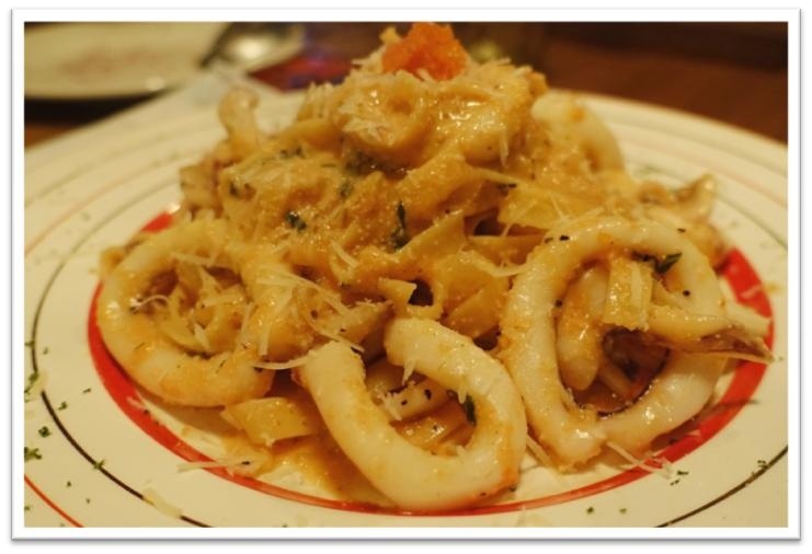我的本日最愛!寬扁麵條Q彈帶點硬度.主廚毫不心疼的使用了大量的明太子.每一條麵條,每一塊花枝都裹上滿滿的辣明太子醬!不過真的有點辣,不吃辣的人自行斟酌一下囉!