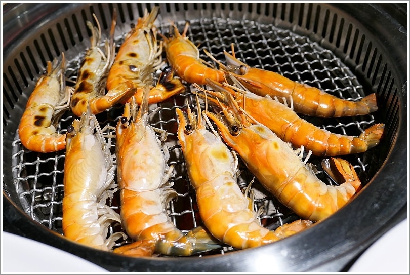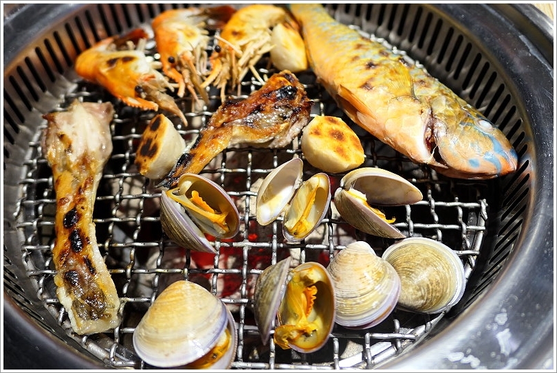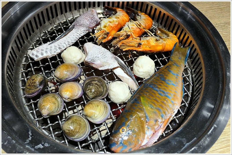 ▼吃完一鍋泰國蝦之後,接下來就是烤其他的海鮮食材啦~像是鸚哥魚、赤嘴蛤、魚下巴、泰國蝦與花枝丸,有些食材感覺是不常會出現在燒肉店的海鮮啊(笑)!