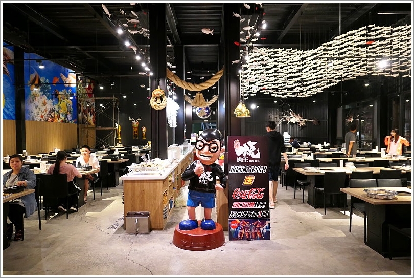 ▼一進到裡頭,中間就是燒肉王本人的大型公仔,大家可以來拍照打卡,不定時還會推出消費打卡的贈品活動唷!挑高的空間搭配魚群的裝飾與水母吊燈,營造出海邊的特色氛圍~感覺超有FU!