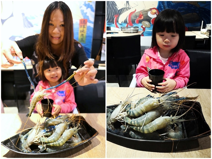 ▼我們一行人瞬間拿了一大盤滿滿的泰國蝦,小口愛剛開始看了有點驚驚,完全不敢動~後來看到口咩拿起來拍照才笑了出來!