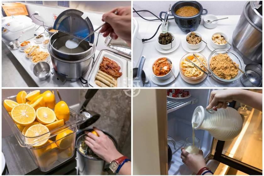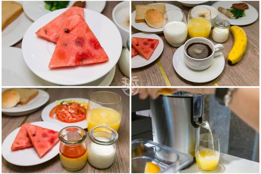 早餐吧有熟食區、水果飲料區、提供中式的稀飯與西式的麵包與沙拉。