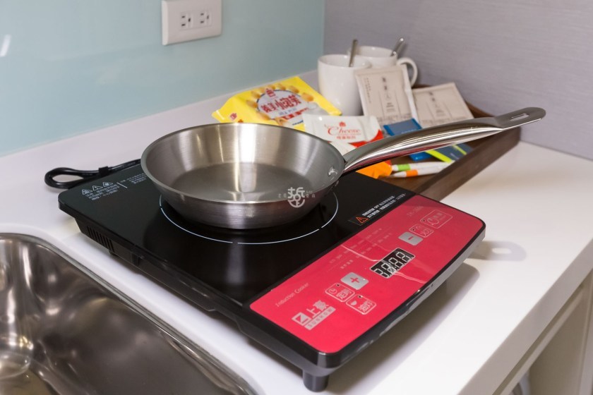書桌旁即是小型的流理臺,有洗碗槽、冰箱、微波爐、熱水壺、電磁爐、鍋具、飲用水以及隨身包。
