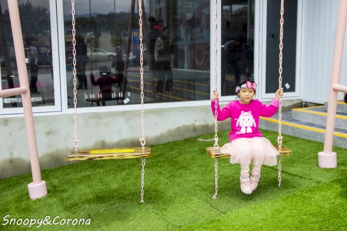 門口佈置了人工假草皮及粉紅盪鞦韆,雖然鞦韆是固定式的不能盪,