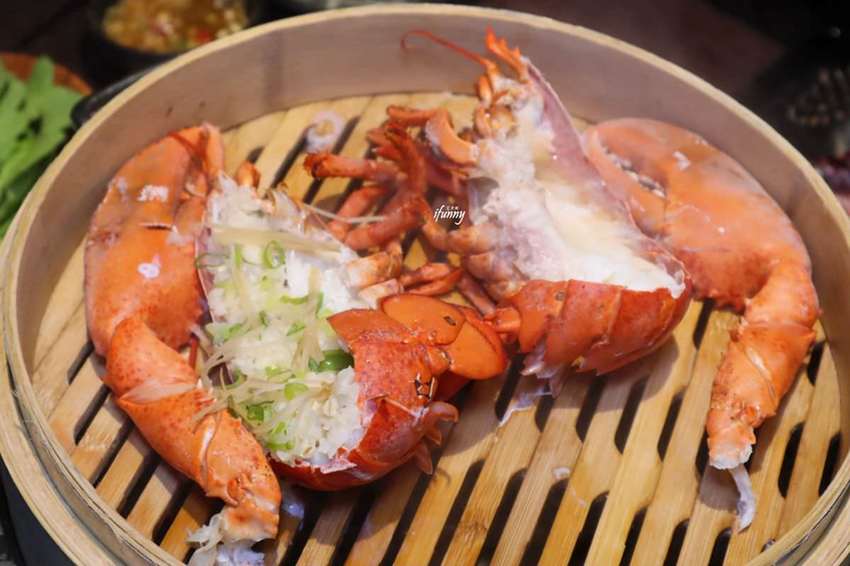 蒸熟的龍蝦呈現橘紅色,在蒸籠的煙霧下更是引人食慾大增啊!