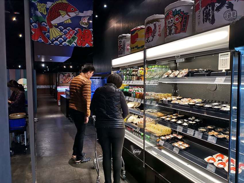 利用走道旁架設了像超市般的冷藏櫃,並且在店內設有水族箱,裡頭可是活跳跳的活體海鮮們呢!