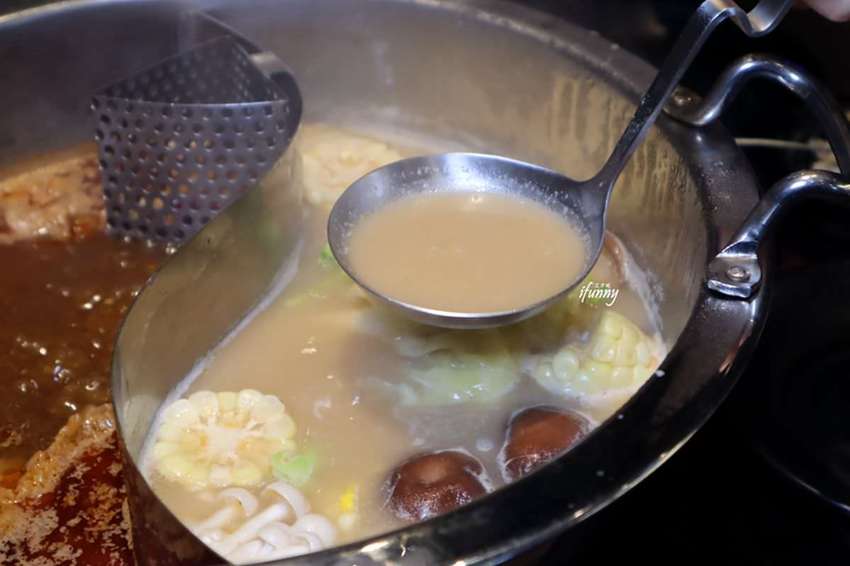 我們另加價$70,變成了鴛鴦鍋。選了川府麻辣湯及豬肚雞高湯。超越水產超市火鍋的湯匙是特製的,有個彎度可以跨在鍋邊不易滑落。