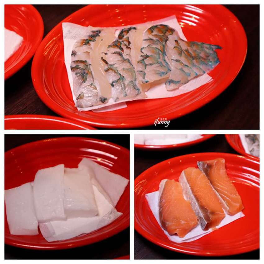 超越水產超市火鍋備有一些特別的魚片,由上至右下,是日料常見的青衣,富膠原蛋白的曼波魚,還有厚實的鮭魚。