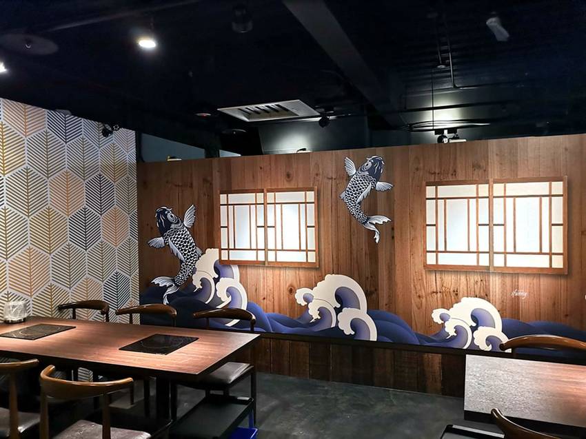 飾以飛躍魚的牆面,有種居酒屋或日式食堂的氛圍。