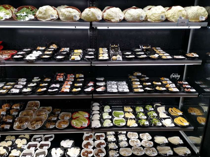 這若沒說,會真以為是來到超市吧!常見在火鍋中的蔬菜、菇類、火鍋餃類,把食材都分裝成1~2人份,這是一個人也能來吃火鍋的好選擇啊!