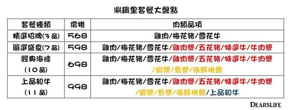 涮鍋里吃到飽有四種套餐方案,同桌客人須點同一方案。