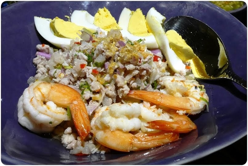 在底部的茄子吸飽湯汁,拌著肉末吃,酸甜辣的滋味在入口後炸開流竄的滋味甚是美好,另外還有水煮蛋和鮮甜蝦,以涼拌沙拉來說非常豐盛。