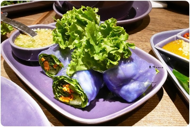 春捲皮用蝶豆花染色,視覺上跟藍色蝶豆花香飯一樣獨特豐富,捲在走視覺系涼皮裡有萵苣、紅蘿蔔、小黃瓜、九層塔、薄荷葉等的蔬菜,還能夠吃到整隻川燙熟成帶有甜味的蝦肉,酸中有甜的醬汁帶來清新爽脆的好滋味。