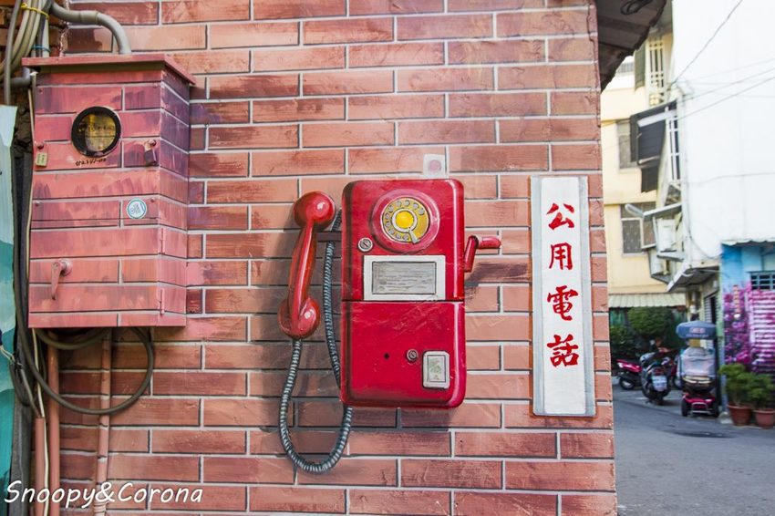 復古的公用電話也彩繪得好像,遠看還真能以假亂真。