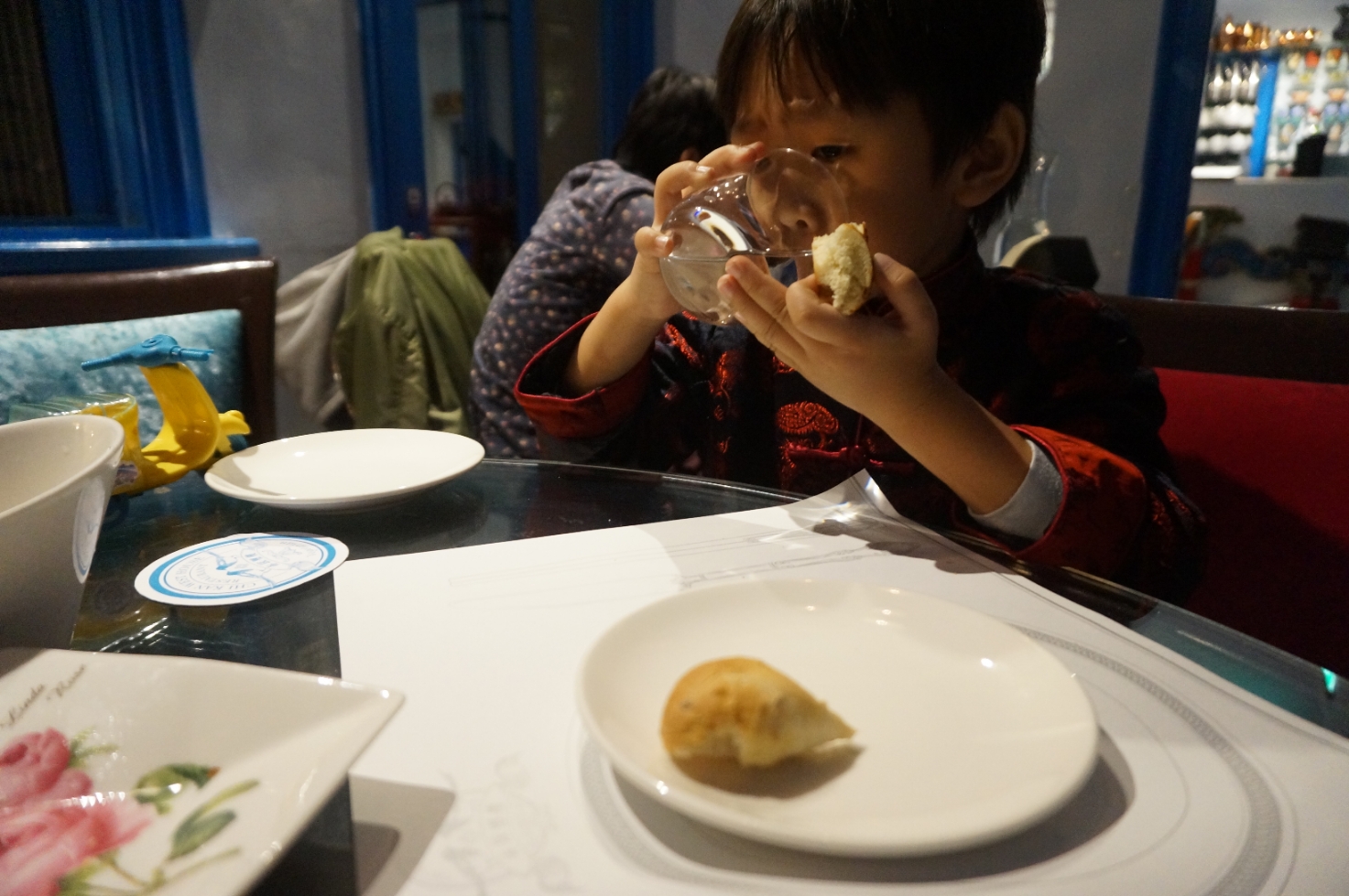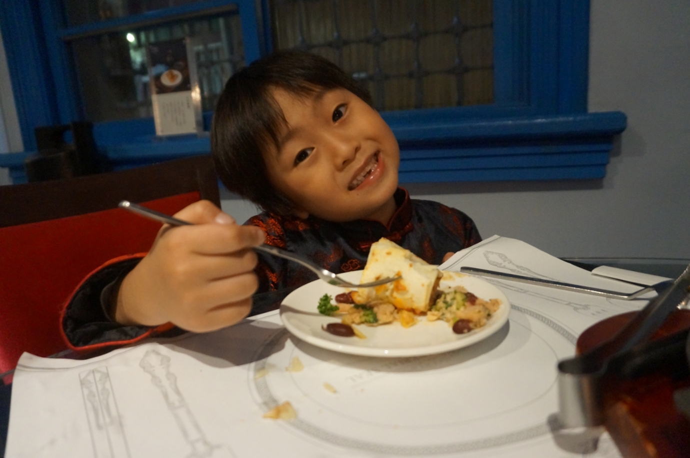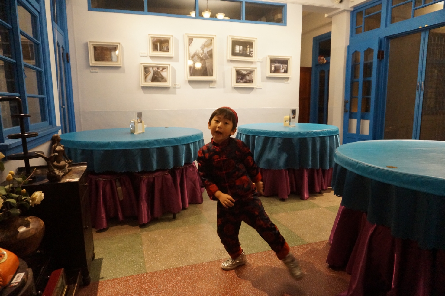 更要自己拿餐具,五歲的年紀就是店小二上身~櫃子也好復古,赤崁壐樓處處是古董啊~