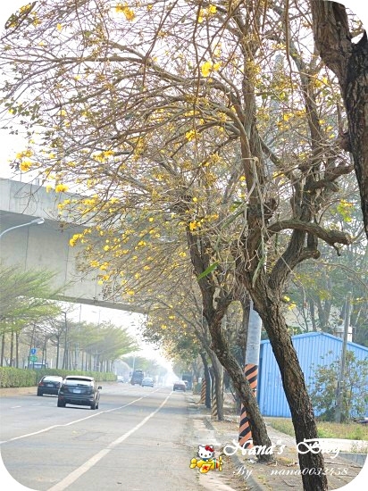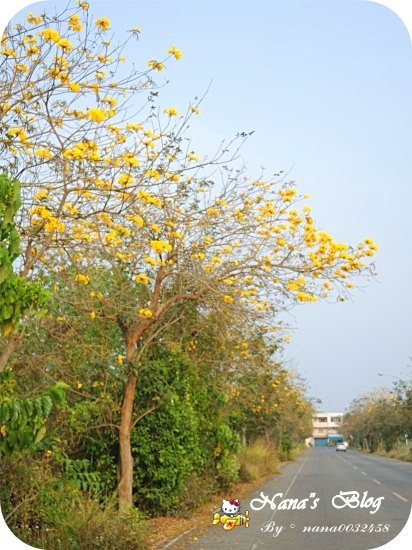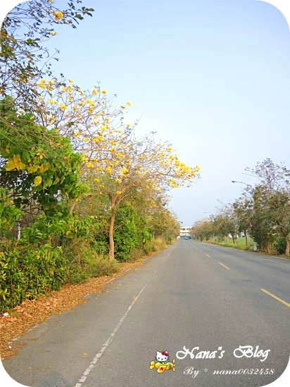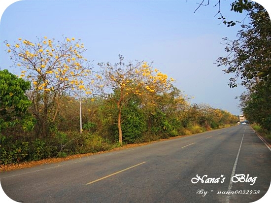 的照射下,閃閃發亮,沿著這條台一線前進,兩旁的黃金風鈴木,在公路旁盛開