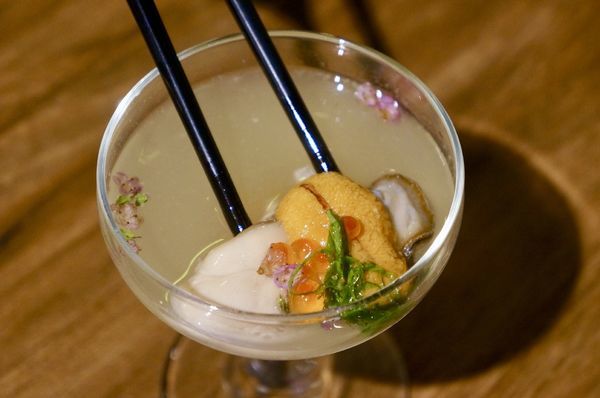 以柚子酒為基底m,裏頭有非常新鮮又飽滿又大顆的生蠔,及甜而不腥的海膽!並點綴著Q彈鮭魚卵,非常富有層次的口感~ 重點是很鮮美!鮮甜!完全令人印象深刻~會為了這到特別的料理下次再來絕好調用餐!!!(滿足~~