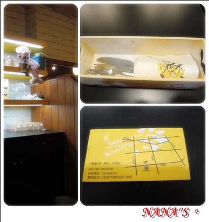 餐具區,桌上的餐具是以木盒放置,感覺好精緻!名片則以黃色的背景,突顯出鯊魚咬土司的特色