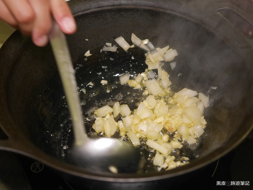 剛開始會先用奶油做底,接下來加入洋蔥炒過