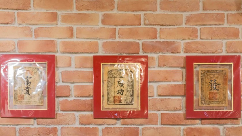 客廳內陳列著早期的收藏,有電視、風扇以及沙發等,牆上掛著是復刻板古代錢莊的銀票。