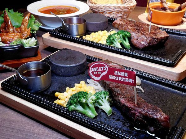 主打高級牛排平價販售的兩樂兩肋Meat2 ,牛排上桌時還會有超熱熱的"熱石" ,所以牛排上桌時約為3~5分熟