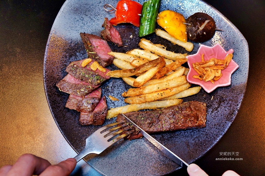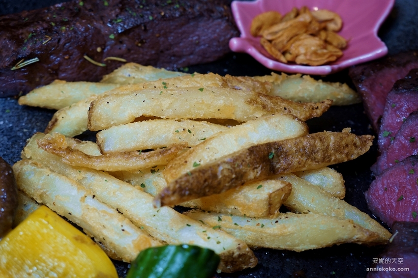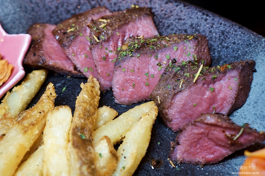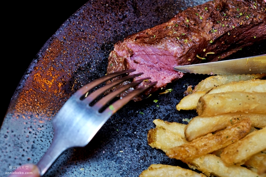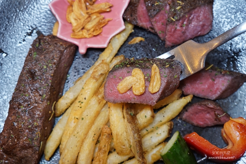 嚴選美國嫩肩牛,採用獨特真空低溫舒肥方式料理,耗時費工的程序,就是要讓牛肉鎖住最完美精華肉汁與豐美的風味,牛肉表面經過炙燒後,灑上簡單的香料,搭配烤鮮蔬以及帶皮薯條,加上烘烤過脆口甘甜的蒜片,這一盤極具高檔餐廳水準的嫩肩牛排令人垂涎啊,那粉嫩的牛肉色澤,令人食指大動。