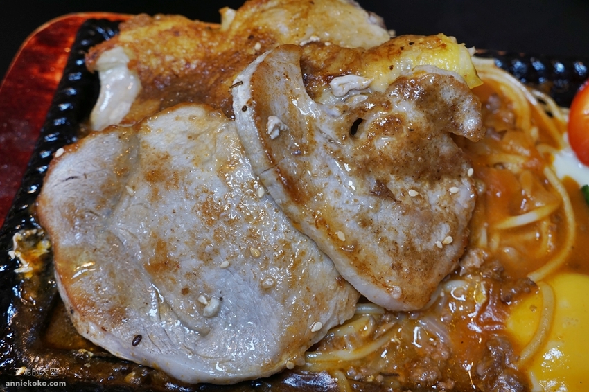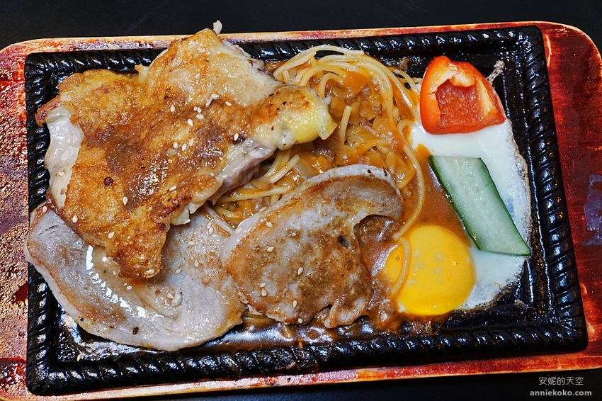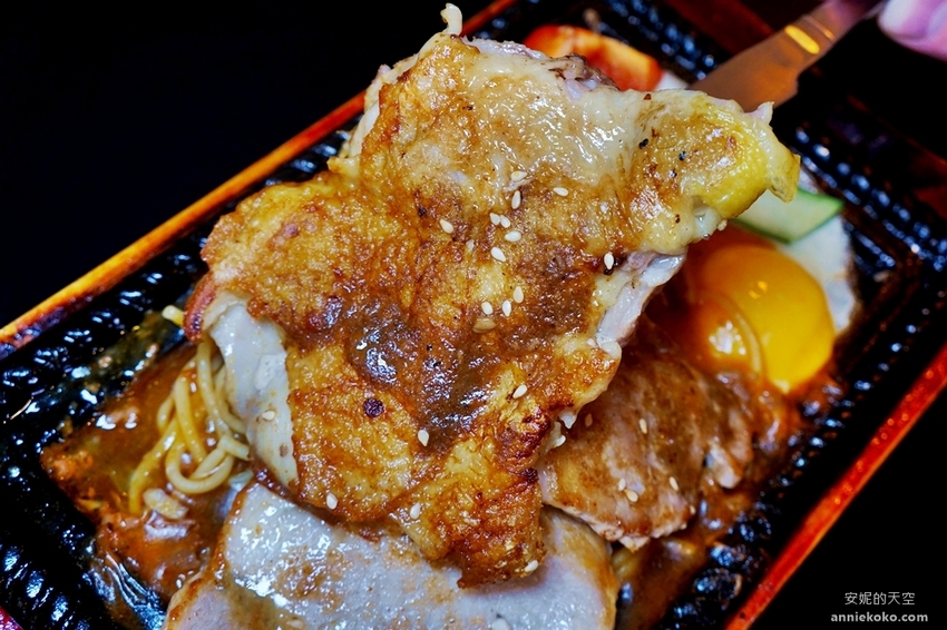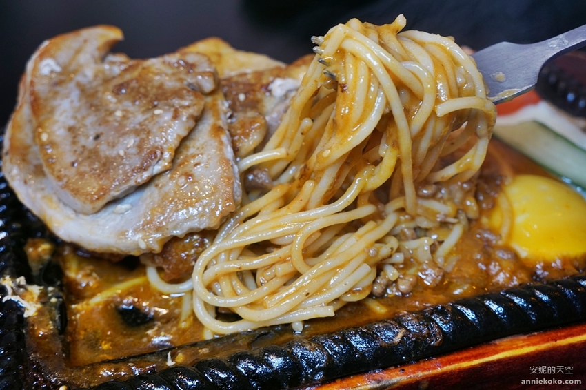 冒著煙滋滋作響的鐵盤排餐送上桌,揉揉眼我不敢相信,這一個鐵盤上有豬排有雞腿的排餐加上嫩蛋竟然不到200元,CP值是否太高了,鋪滿大塊雞腿肉與豬排的下方還有堆的跟小山一樣的麵條,這一盤吃完我應該可以飽上一整天了,如果口袋預算不高,又想要大口大口吃肉,點這一盤真的超級划算。