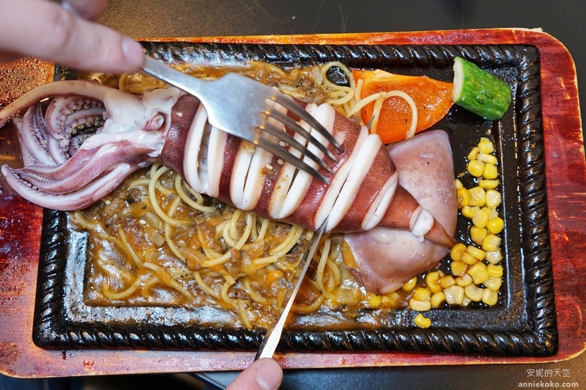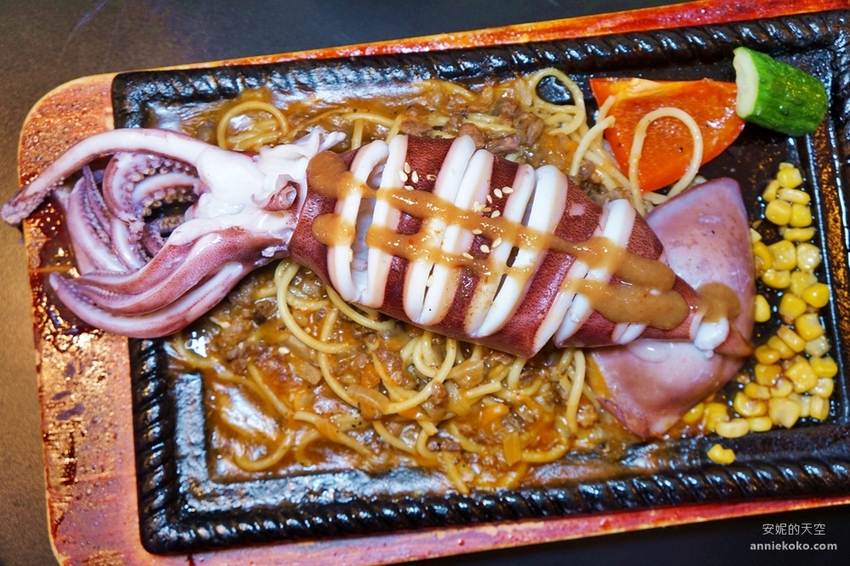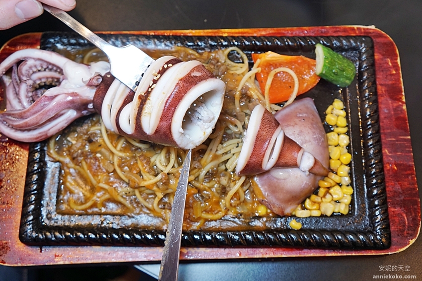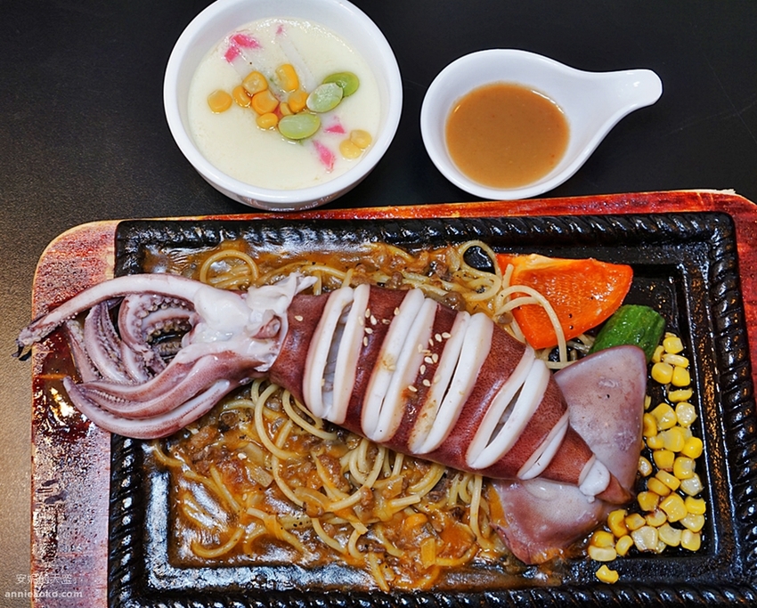 來自阿根廷的墨魚豪邁上場,巨大的墨魚幾乎都快要超過鐵盤了,鐵盤中除了墨魚外還有鐵板麵以及蔬菜,搭配海鮮醬汁以及日式茶碗蒸,滿盤的濃濃海味讓人想要大快朵頤。