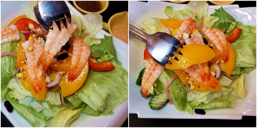 沙拉裡頭除了生菜與鮮蝦外,還有水蜜桃與柑橘,還灑上超多的堅果,一整個超澎派,醬料還可以自選,有千島醬與和風醬,我偏愛和風醬多一點,將醬汁淋在沙拉裡,吃起來十分清爽。